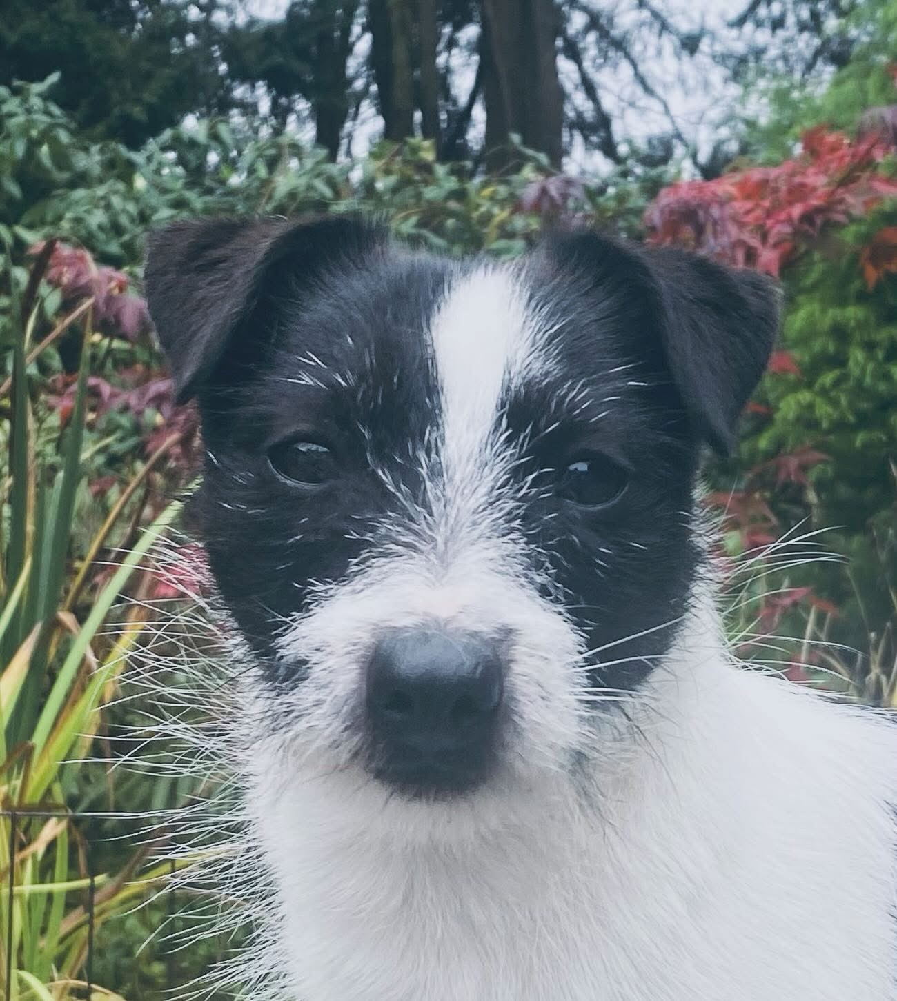 Smudge is a black/white broken coat daughter of Harry and Millie, she is very empathetic and always tries her best to be a good girl, never puts a foot out of line, gets on with everyone and loves her humans, she really likes toys, will play all day and gather up all the toys and hoard them to herself, her and Lucy like a little sisterly love over tennis balls, with both trying to get 2 in their mouths to bring to me to throw. Smudge also really enjoys sunbathing, when we see sun in Ireland that is!!! and watching the koi in the pond.